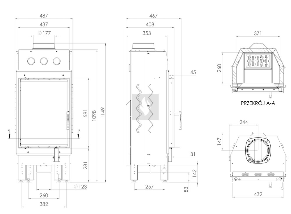 A kerámia betét felhalmozza a hőt és akár 1000°C-ig ellenáll a hőmérsékletnek. A klasszikus hatszögletű égéstér kisebb mérete magasabb égési hőmérsékletet eredményez. A rács és a hamutálca megkönnyíti a hamu eltávolítását és a fa maradványainak összegyűjtését. Az AL120x43 modell kivételével, amely nem rendelkezik ráccsal.