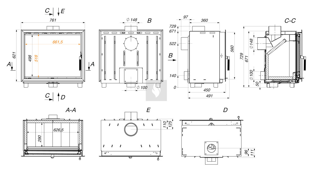 A kazettás kandallóbetét gyártásához melegen hengerelt, alacsony ötvözésű szénacél kerül felhasználásra. A bélés 30 mm vastag vermikulitból és 35 mm vastag cseh samottból készül, amelyek kiváló hőtároló és hőálló tulajdonságokkal rendelkeznek.