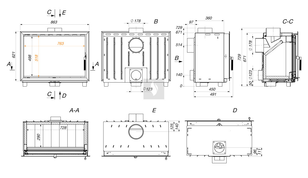 A kazettás kandallóbetét gyártásához melegen hengerelt, alacsony ötvözésű szénacél kerül felhasználásra. A bélés 30 mm vastag vermikulitból és 35 mm vastag cseh samottból készül, amelyek kiváló hőtároló és hőálló tulajdonságokkal rendelkeznek.