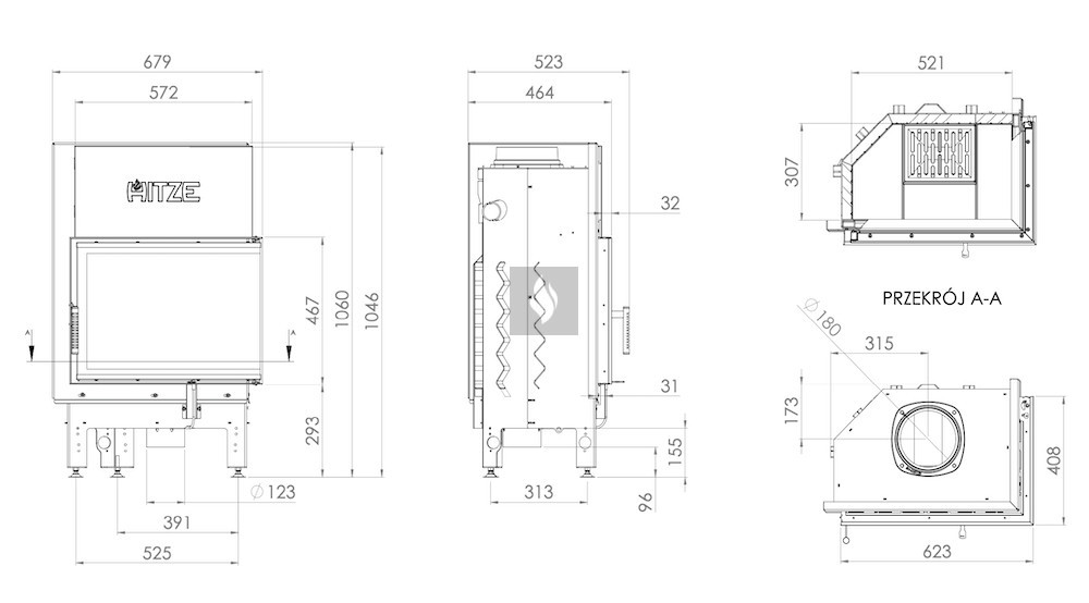 A kerámia betét felhalmozza a hőt és akár 1000°C-ig ellenáll a hőmérsékletnek. A klasszikus hatszögletű égéstér kisebb mérete magasabb égési hőmérsékletet eredményez. A rács és a hamutálca megkönnyíti a hamu eltávolítását és a fa maradványainak összegyűjtését. Az AL120x43 modell kivételével, amely nem rendelkezik ráccsal.