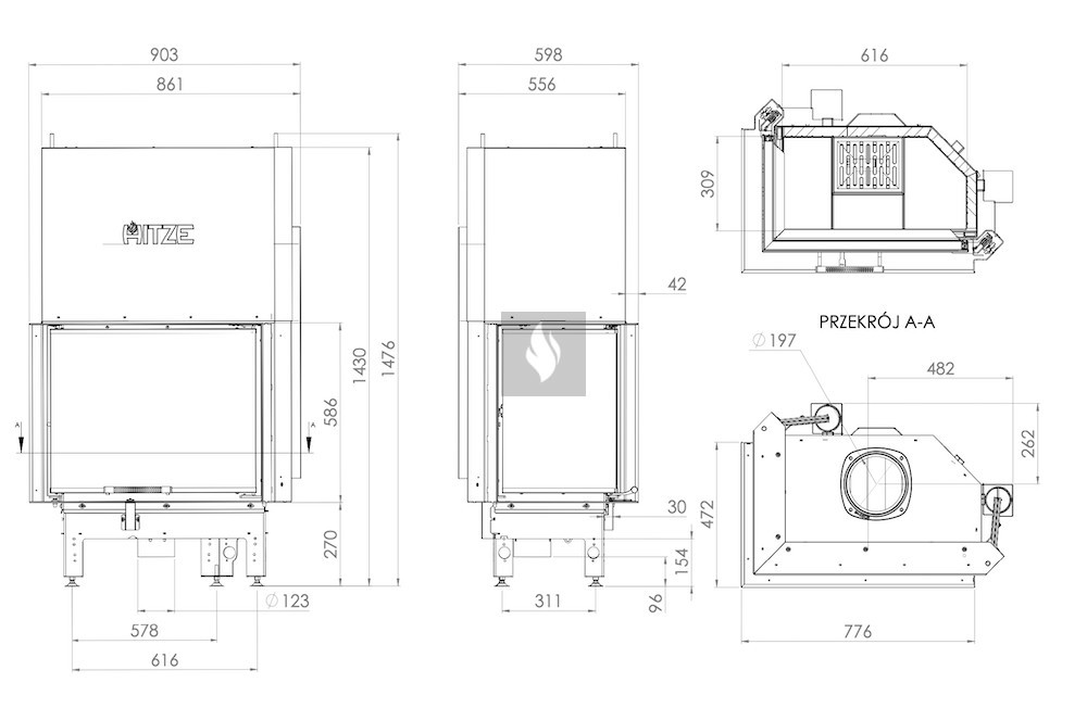 A kerámia betét felhalmozza a hőt és akár 1000°C-ig ellenáll a hőmérsékletnek. A klasszikus hatszögletű égéstér kisebb mérete magasabb égési hőmérsékletet eredményez. A rács és a hamutálca megkönnyíti a hamu eltávolítását és a fa maradványainak összegyűjtését. Az AL120x43 modell kivételével, amely nem rendelkezik ráccsal.
