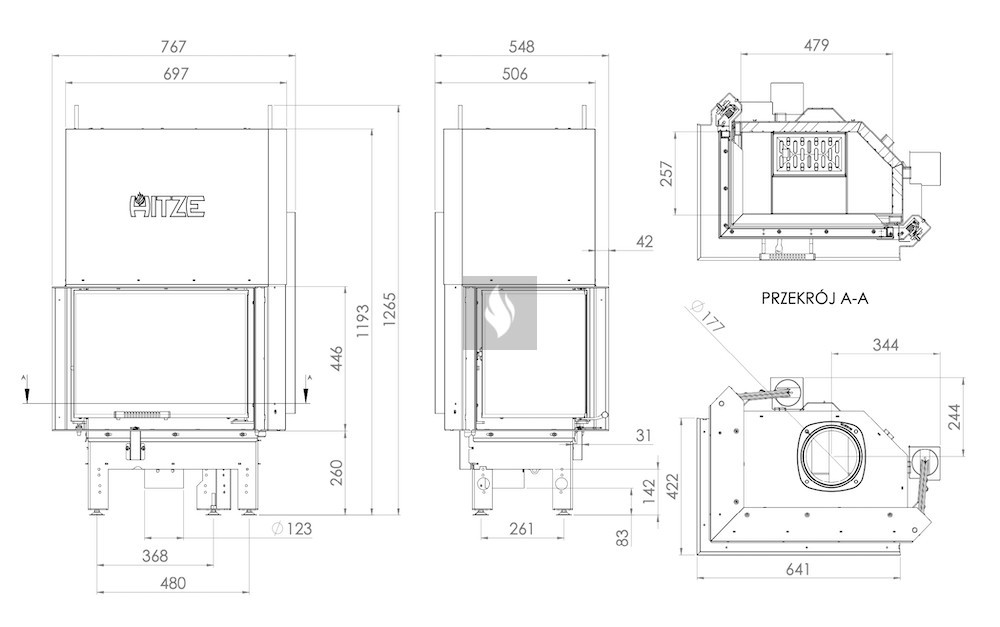 A kerámia betét felhalmozza a hőt és akár 1000°C-ig ellenáll a hőmérsékletnek. A klasszikus hatszögletű égéstér kisebb mérete magasabb égési hőmérsékletet eredményez. A rács és a hamutálca megkönnyíti a hamu eltávolítását és a fa maradványainak összegyűjtését. Az AL120x43 modell kivételével, amely nem rendelkezik ráccsal.