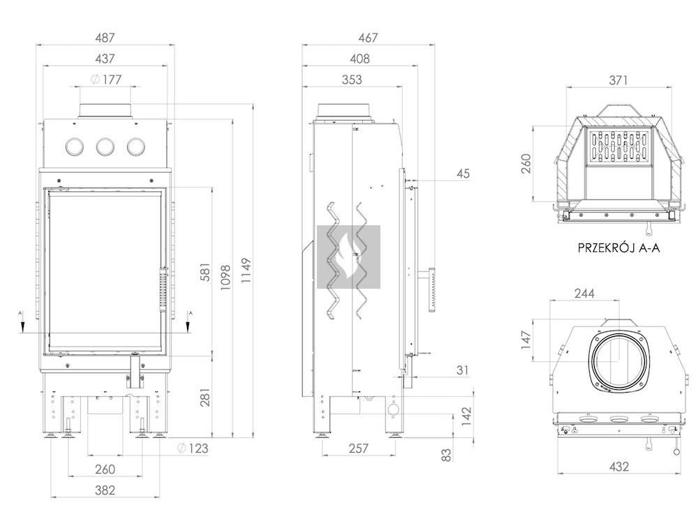 A kerámia betét felhalmozza a hőt és akár 1000°C-ig ellenáll a hőmérsékletnek. A klasszikus hatszögletű égéstér kisebb mérete magasabb égési hőmérsékletet eredményez. A rács és a hamutálca megkönnyíti a hamu eltávolítását és a fa maradványainak összegyűjtését. Az AL120x43 modell kivételével, amely nem rendelkezik ráccsal.