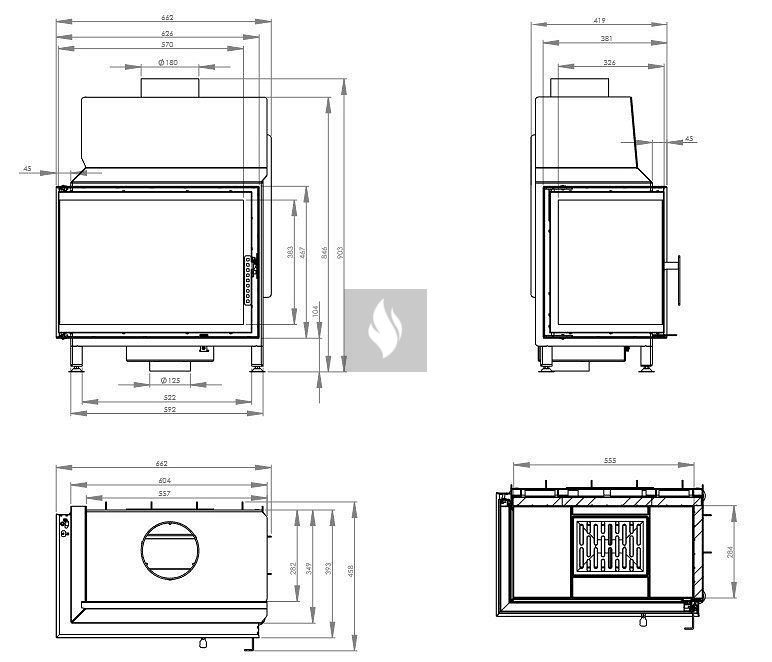 A hőálló kerámiaüveg biztosítja a magas hőmérsékletnek (akár 800°C-ig) való ellenállást, és opcionálisan dupla üvegezési rendszerben is elérhető. Az ø125 mm-es légbevezető nyílás és a betét acél alapja lemezes légfojtóval van ellátva. Az ø180 mm-es öntöttvas füstcső garantálja a kandalló és a kéménycsatorna szoros csatlakozását, biztosítva a megfelelő égést és a hőcsere területének növelését. A rács és a hamutálca megkönnyíti a hamu eltávolítását és a fa maradványainak összegyűjtését.