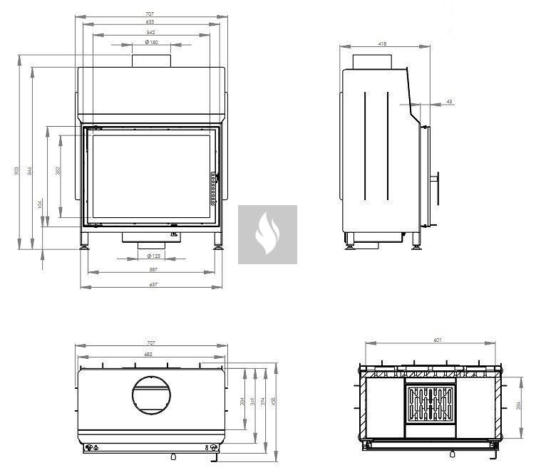 A hőálló kerámiaüveg biztosítja a magas hőmérsékletnek (akár 800°C-ig) való ellenállást, és opcionálisan dupla üvegezési rendszerben is elérhető. Az ø125 mm-es légbevezető nyílás és a betét acél alapja lemezes légfojtóval van ellátva. Az ø180 mm-es öntöttvas füstcső garantálja a kandalló és a kéménycsatorna szoros csatlakozását, biztosítva a megfelelő égést és a hőcsere területének növelését. A rács és a hamutálca megkönnyíti a hamu eltávolítását és a fa maradványainak összegyűjtését.